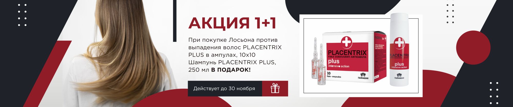 Воспользуйтесь специальной акцией 1+1, которая продлится с 20 мая по 30 ноября.Условия просты: приобретая лосьон против выпадения волос PLACENTRIX PLUS в ампулах, 10х10, вы получите в подарок шампунь PLACENTRIX PLUS, 250 мл.