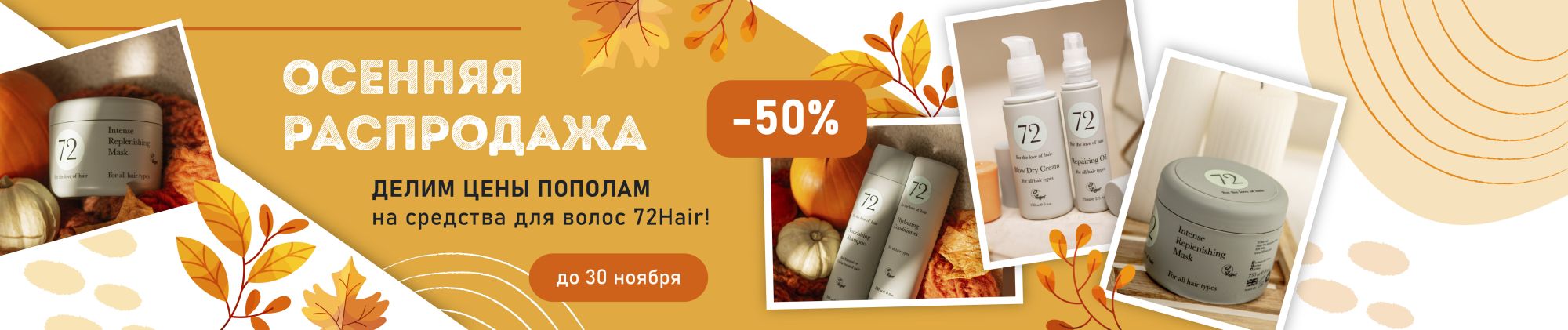 С 25 августа по 30 ноября 2025 года покупайте профессиональные средства для волос бренда 72Hair со скидкой 50%!
